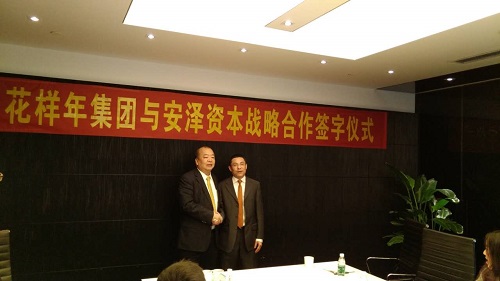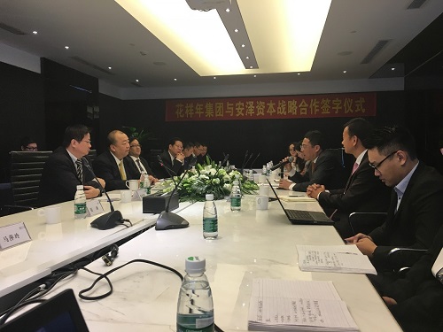 2016年12月2日,花樣年集團(tuán)與安澤資本在深圳簽訂戰(zhàn)略合作協(xié)議,花樣年控股董事局主席潘軍先生及安澤資本創(chuàng)始合伙人顏光茂先生共同出席并在簽字協(xié)議上簽字?;幽昙瘓F(tuán)副總裁林錦堂、助理總裁簡(jiǎn)堅(jiān)訓(xùn)、助理總裁鄧波、地產(chǎn)集團(tuán)總裁劉宗保、安澤資本總經(jīng)理吳亮共同出席了本次簽字儀式。