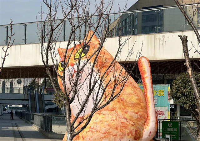 青年藝術(shù)家龍荻的「大貓」,或調(diào)皮或拽萌,或顯露或藏匿,在「花生唐」商場的“聲色犬馬”處,在「彩子家」生活空間的“燈火闌珊”里。繁花大貓,童話野心,繽紛煙火。